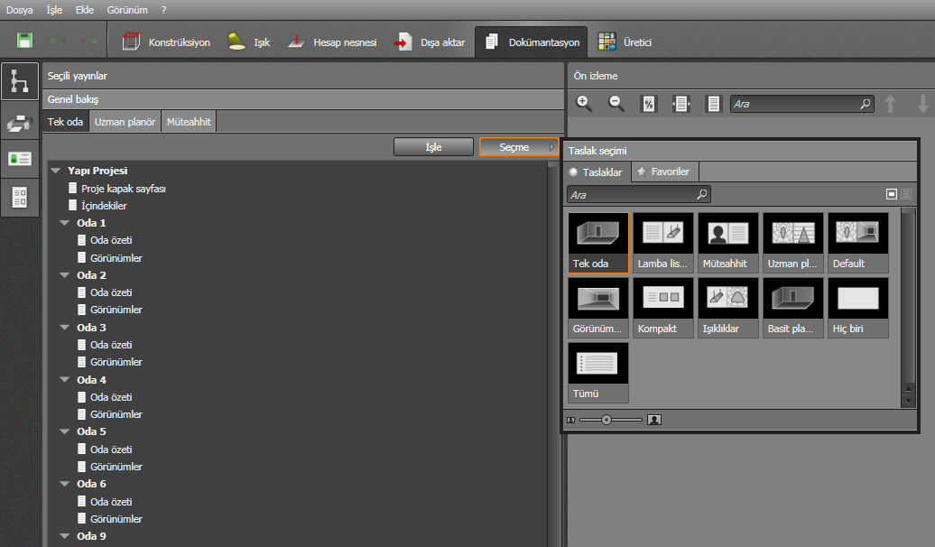 Türkçe sürümde bu taslakların isimleri; Görünümler (Views), Uzman planör (Technical Planner), Müteahhit (Luminaire List) şeklindedir. Bu üç taslak dışındaki taslaklara ise Seçme butonu ile ulaşabiliriz. Edit (İşle) butonuna basarak seçili taslağı düzenleyebilirsiniz. Örneğin, çalışma düzlemi için yanlış renkler görüntülemesini aktif edebilirsiniz.