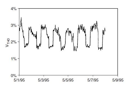 Gerilim bozulması sabit bir değerdir. Tipik bir sistem üzerinde, harmonik bozulma günlük, aylık ve sezonluk alınır.  Aşağıdaki görselde bir hafta boyunca  günlük alınan bir toplam harmonik bozulması örneği görebilirsiniz. Bu örnek tipik evsel bir fideri temsil etmektedir; öyle ki en yüksek gecikme yükün düşük olduğu geceleri gerçekleşmektedir.
