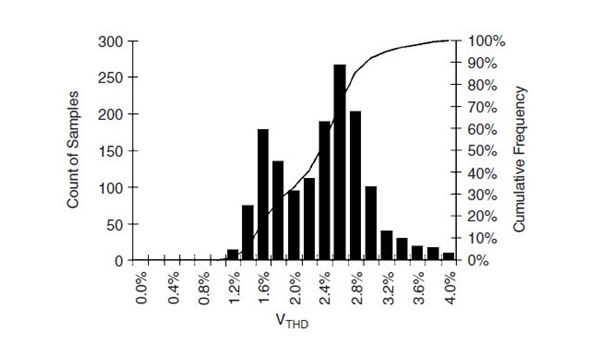 THD örneklerinin toplanmasında kolay bir metod aşağıdaki görseldeki gibi verileri bir histogram ile ifade etmektir. Bu dağılımda iki belirgin zirve vardır bu da bize çift durumlu doğal harmonik bozulma trendini  yansıtır. Bu histogram hazırlanırken, kümülative frekans eğrisi hesaplanır.  Bu tepe değer CP95 olarak bilinir. Bu örnekte gerilimin yüzde 3.17si diğer örneklerin yüzde doksan beşinden daha büyüktür. CP95 genelde dağılımın maksimum değerinden daha büyüktür. Çünkü CP95 parazit ölçümlerine daha az duyarlıdır.