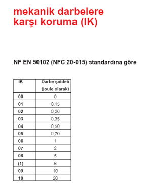 Bazı ürünlerin üzerinde IP koruma standardının 3 basamaklı olduğu görülebilir. Üç basamaklı koruma derecelerinde üçüncü basamak, ürünün mekanik etkilere karşı koruma sınıfını belirtir. Bu koruma derecesi IK olarak da yazılabilir; (IK07 gibi.)