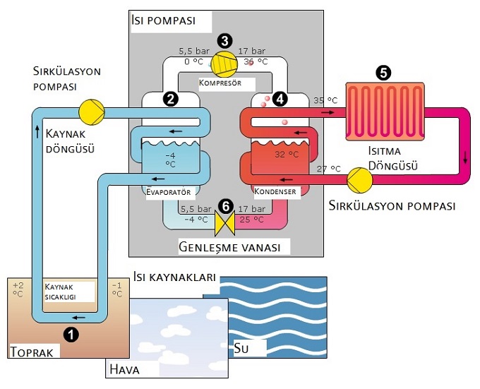 Isı pompasının bileşenleri genleşme vanası, kondenser, kompresör, evaporatör ve soğutucu akışkan olmaktadır.
