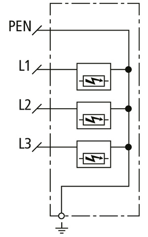 Tested type 1 + type 2 + type 3 combined arrester according to IEC 61643-11 for TN-C systems (3+0 configuration); can be installed completely without tools thanks to click + power connection method for 40 mm busbar systems and push-in earthing terminal; for use in the main power supply system according to IEC 60634-4-44 clause 443 of buildings with an external lightning protection system (class of LPS III/IV). A suitable cover clip according to DIN VDE 0603-1 for every standard meter panel is included in delivery.
