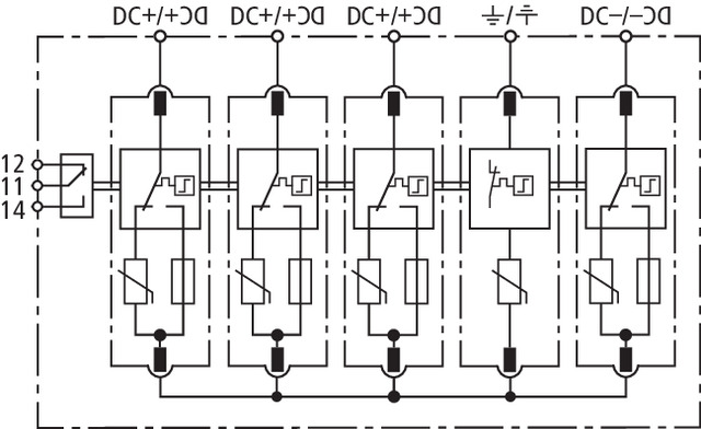 Multipole DEHNguard M PV2 SCI type 2 surge arrester according to EN 61643-31 for protecting 3 MPP inputs. The three-step switching device consisting of a base part and plug-in protection modules with combined disconnection and short-circuiting device with safe electrical isolation in the protection module. For protecting low-voltage consumer´s installations against surges. For use in accordance with IEC 60364-7-712:2002-05 (installation of photovoltaic power supply systems).