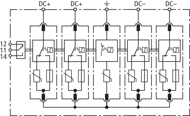 Multipole DEHNguard M PV2 SCI type 2 surge arrester according to EN 61643-31 for protecting 2 MPP inputs. The three-step switching device consisting of a base part and plug-in protection modules with combined disconnection and short-circuiting device with safe electrical isolation in the protection module. For protecting low-voltage consumer´s installations against surges. For use in accordance with IEC 60364-7-712:2002-05 (installation of photovoltaic power supply systems).